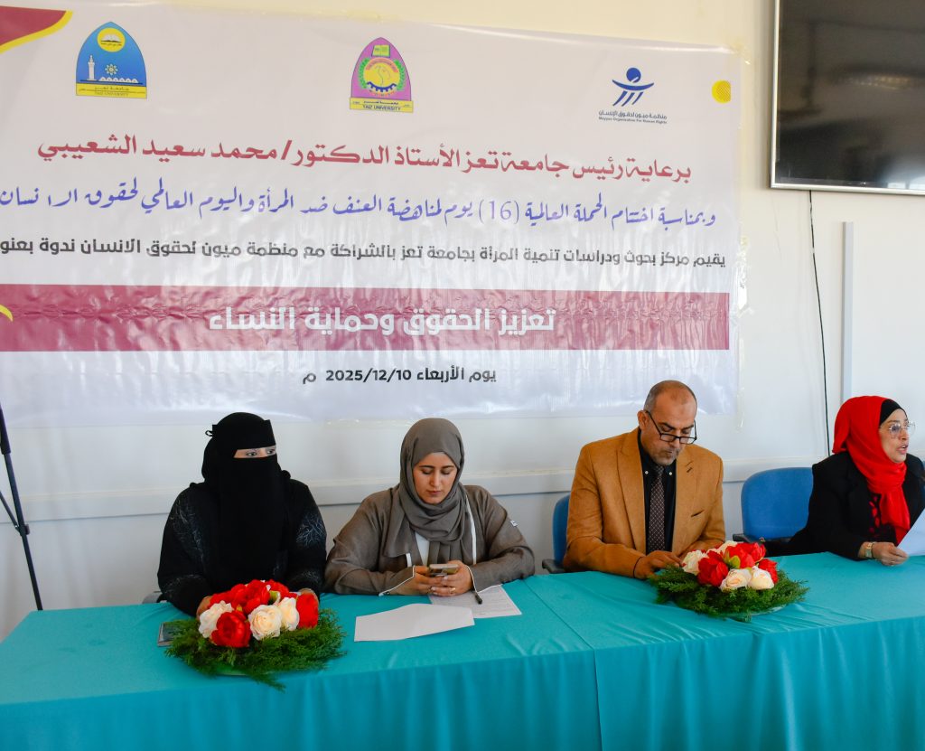 أُقام مركز دراسات المرأة بجامعة تعز ومنظمة ميون لحقوق الإنسان اليوم ندوة توعوية بهدف تعزيز الوعي بالحقوق والحماية القانونية للنساء، وذلك احتفالاً باليوم العالمي لحقوق الإنسان، واختتام الحملة العالمية “16 يومًا لمناهضة العنف ضد المرأة”.