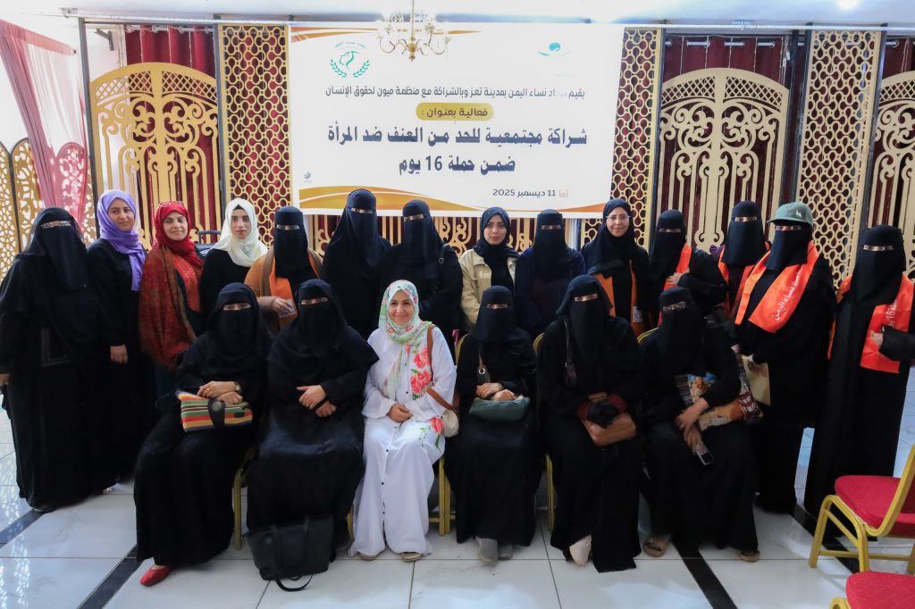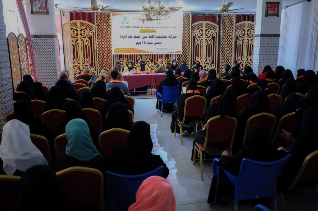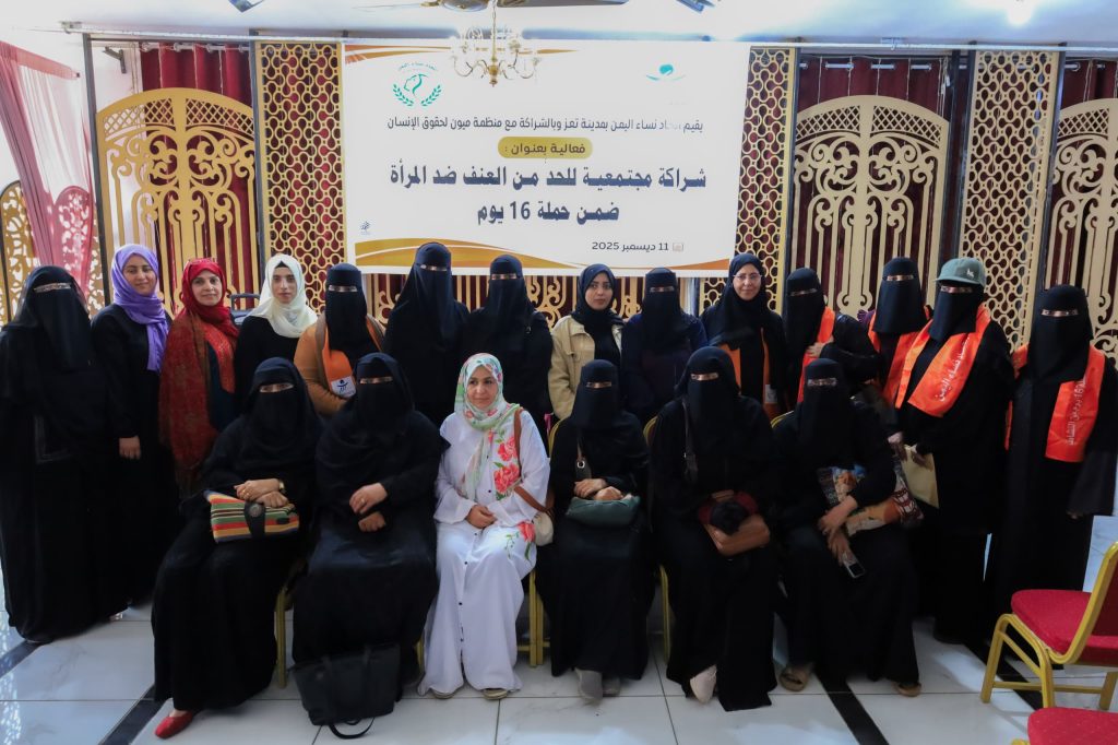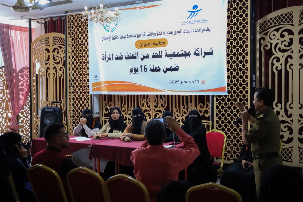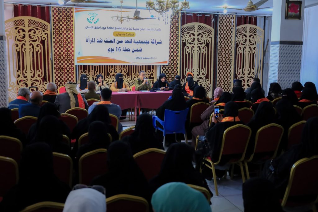 أقام اتحاد نساء اليمن فرع تعز بالشراكة مع منظمة ميون لحقوق الإنسان، صباح اليوم، فعالية مجتمعية تحت عنوان “شراكة مجتمعية للحد من العنف ضد المراة” في ختام حملة 16 يوما العالمية، وذلك بحضور وكيل أول محافظة تعز الدكتور عبدالقوي المخلافي.